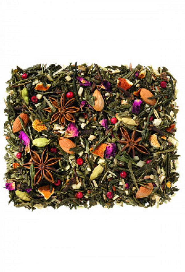 Zutaten: grüner Tee (38%), Orangenschalen, ganzer Sternanis, Mandelstücke, Aprikosenkerne, ganzer Kardamom, Nelken, rosa Pfefferkörner, Zimtstücke, natürliches Aroma, Rosenblüten